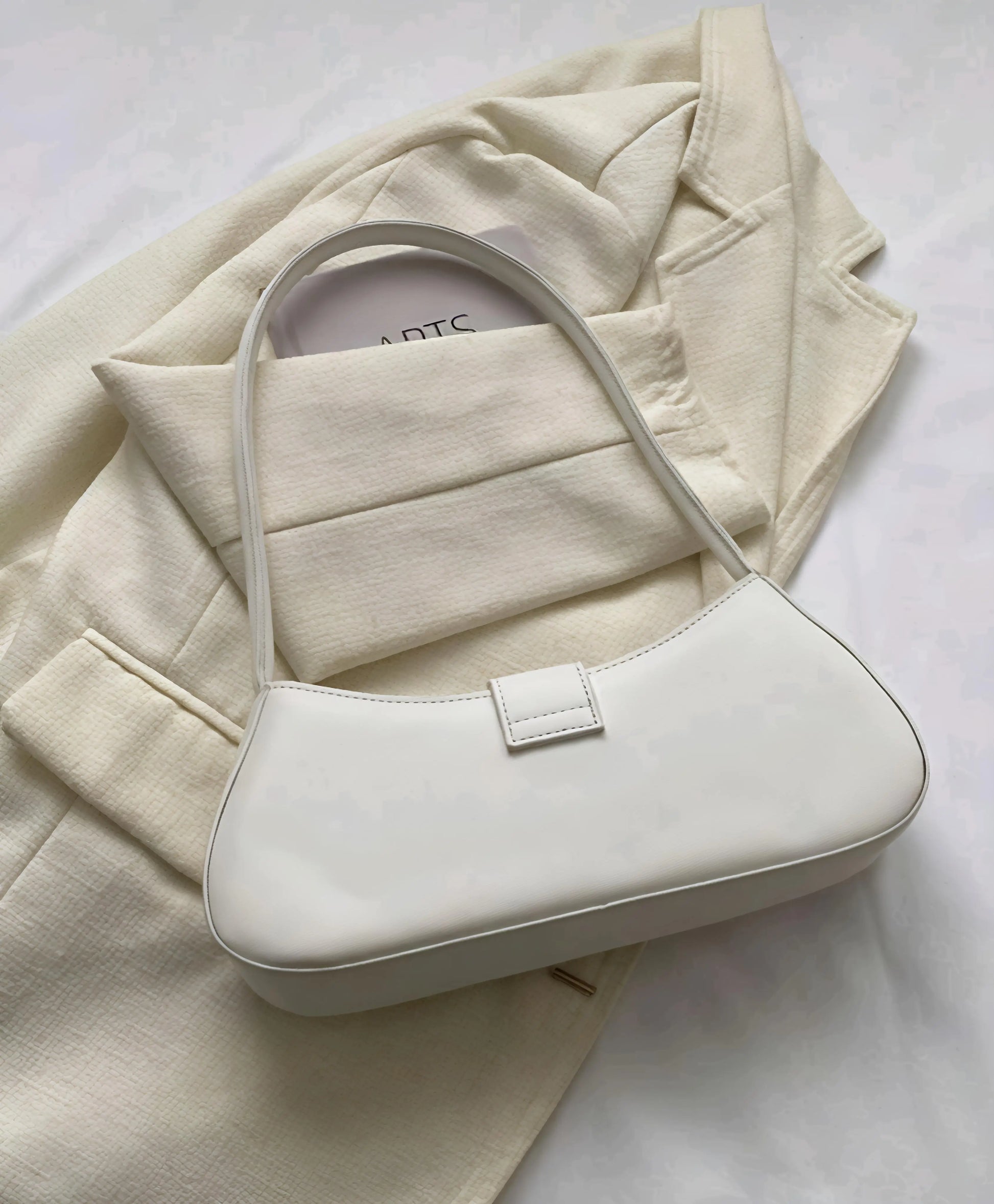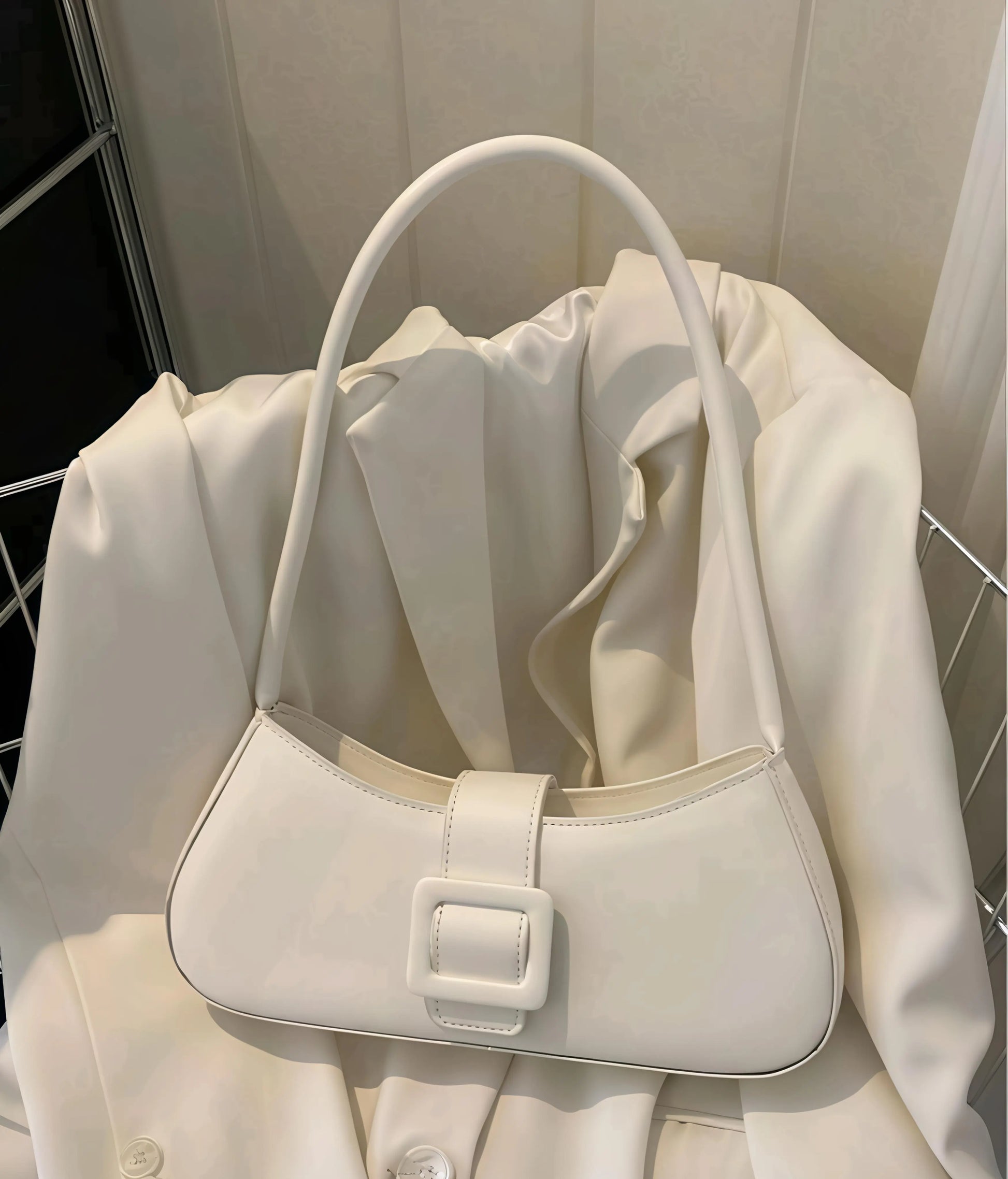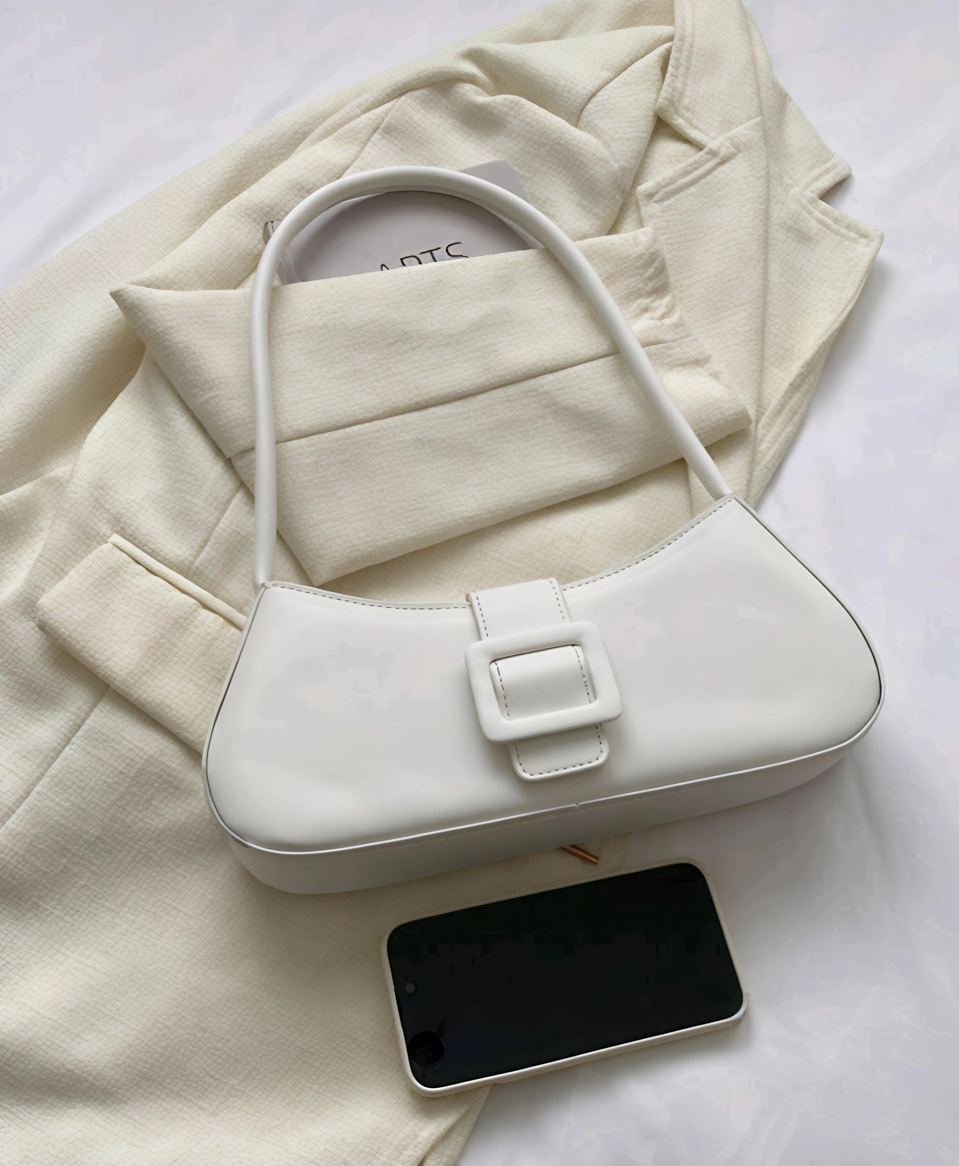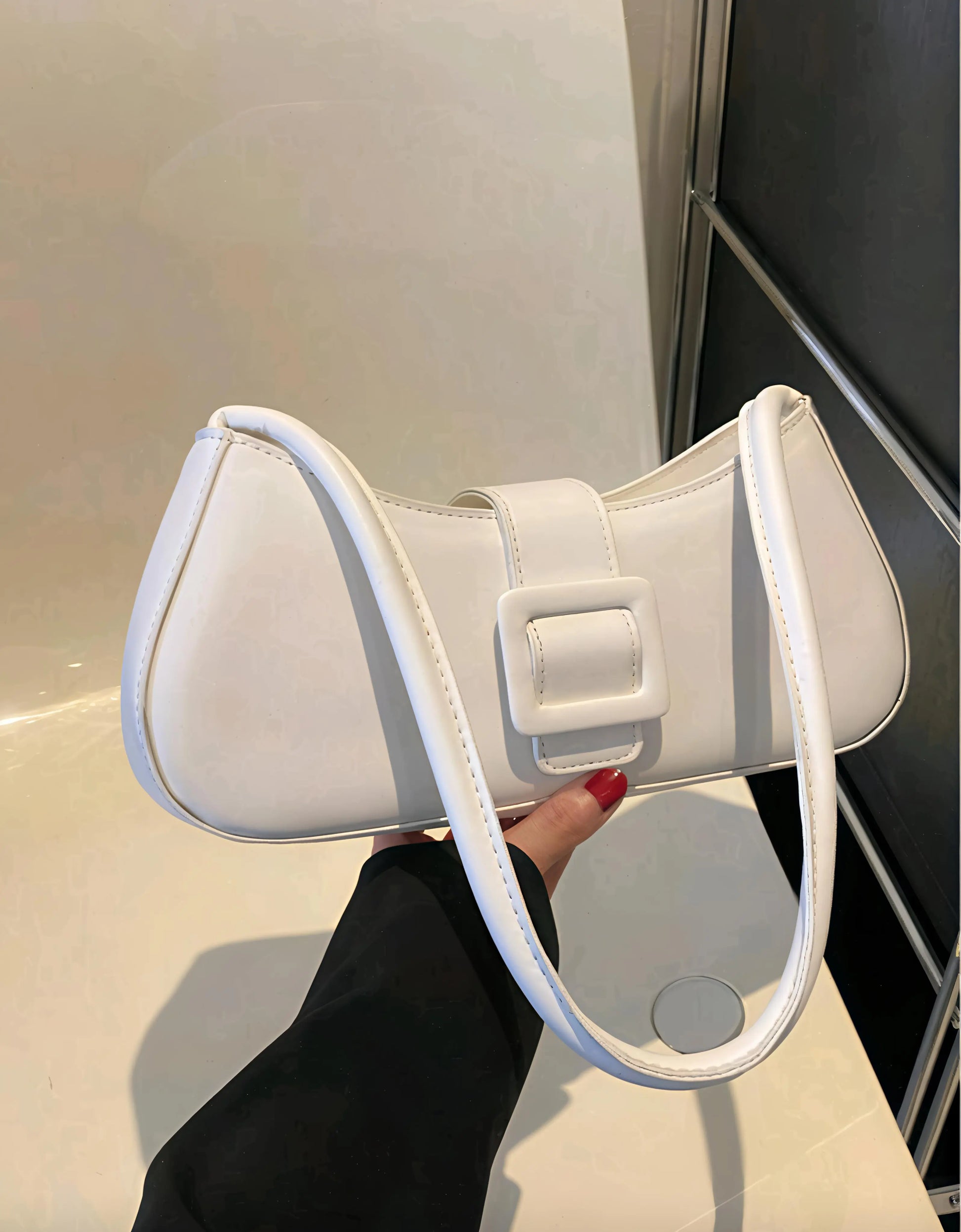 An elegant white shoulder bag designed for modern sophistication. With its smooth finish, structured silhouette, and statement buckle detail, Midnight Grace transitions seamlessly from day to night—making it your ultimate go-to accessory.